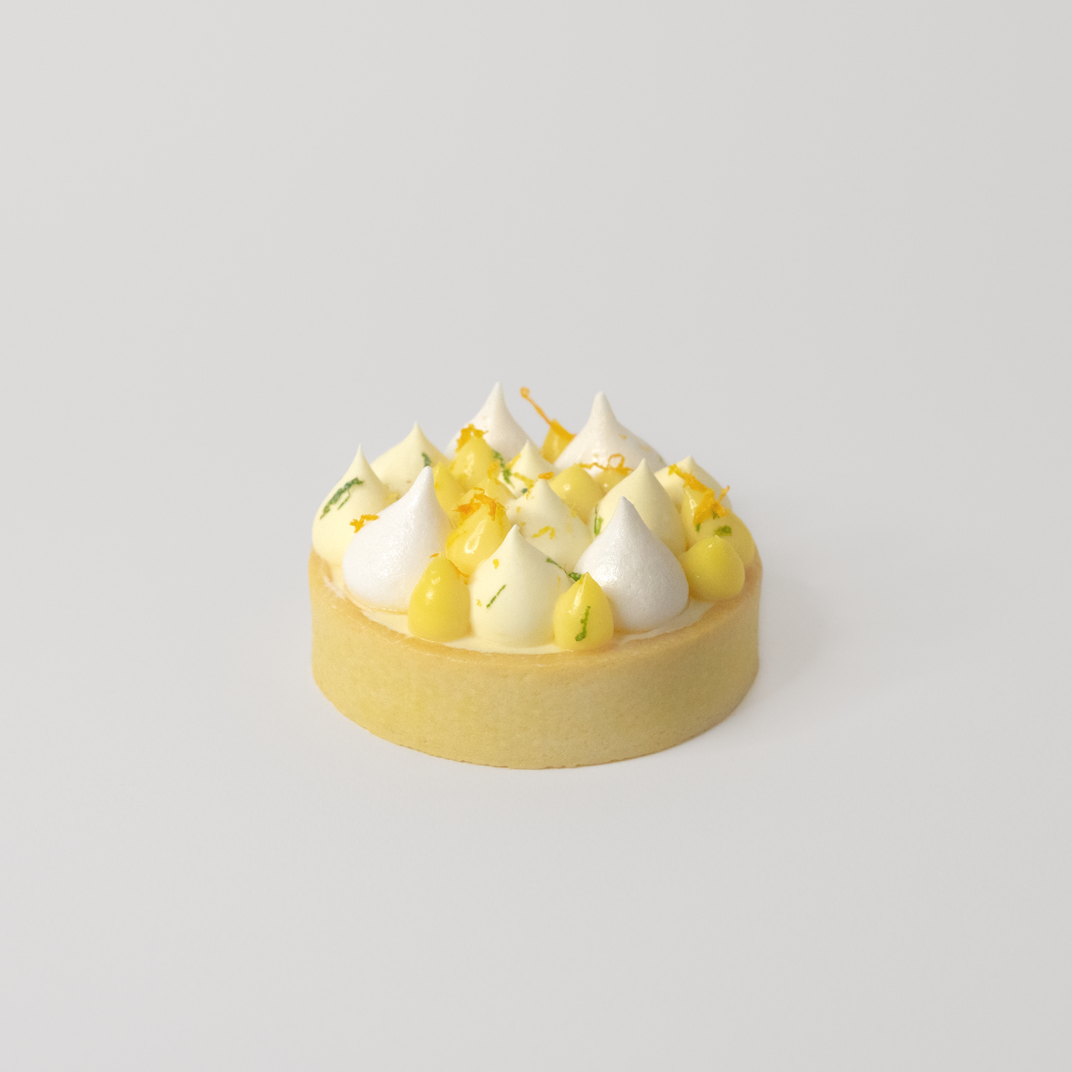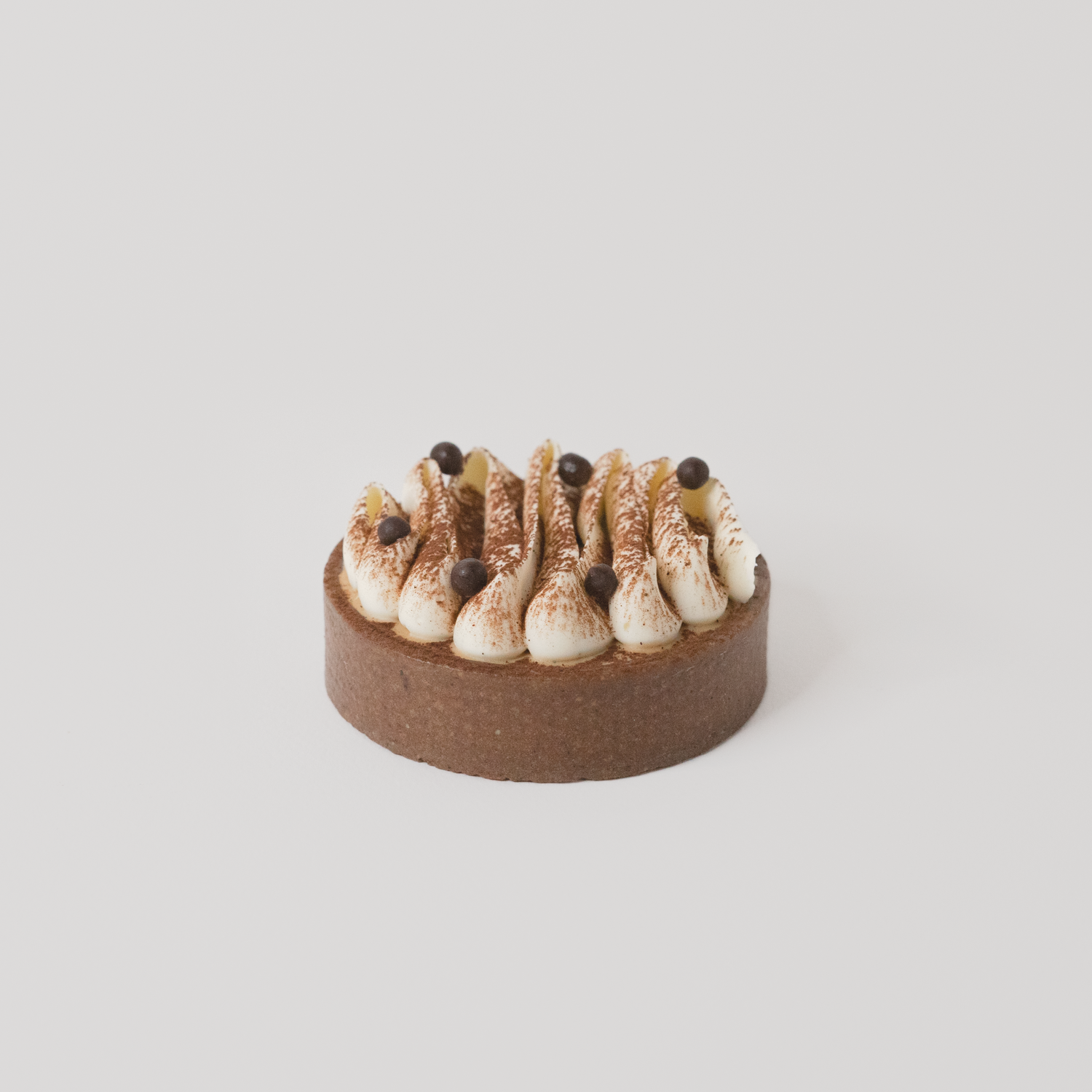 Chocolate sable tart with coffee creameux, flourless chocolate cake, coffee cream, vanilla white chocolate ganache, dusted with cocoa powder, finished with chocolate crunch pearlsLemon Tart