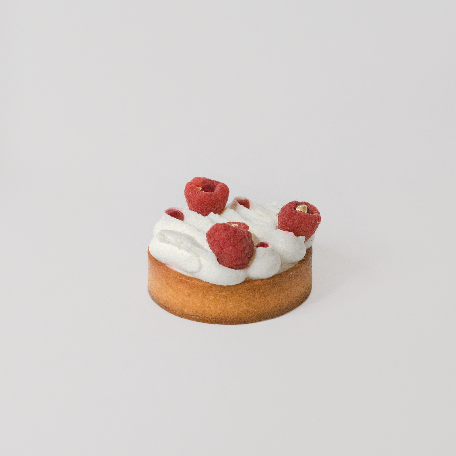Vanilla sable tart with almond cream, raspberry jam, mascarpone cream, fresh raspberriesCanelé